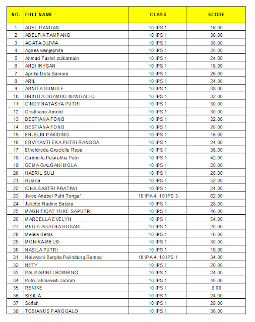 Berikut ini bapak lampirkan hasil perjuangan kalian untuk mapel Bahasa Inggris Lintas Minat dan Bahasa & Sastra Inggris untuk semua kelas. Skor yang ada adalah gambaran penguasaan konsep dari kalian. Masih ada waktu untuk memperbaiki di semester depan. hasil yang kurang di semester ini mungkin "NILAINYA BUKAN JODOH KALIAN". Jika ada yang salah memilih kelas, amati setiap kelas, mungkin nama kalian tercecer di sana.